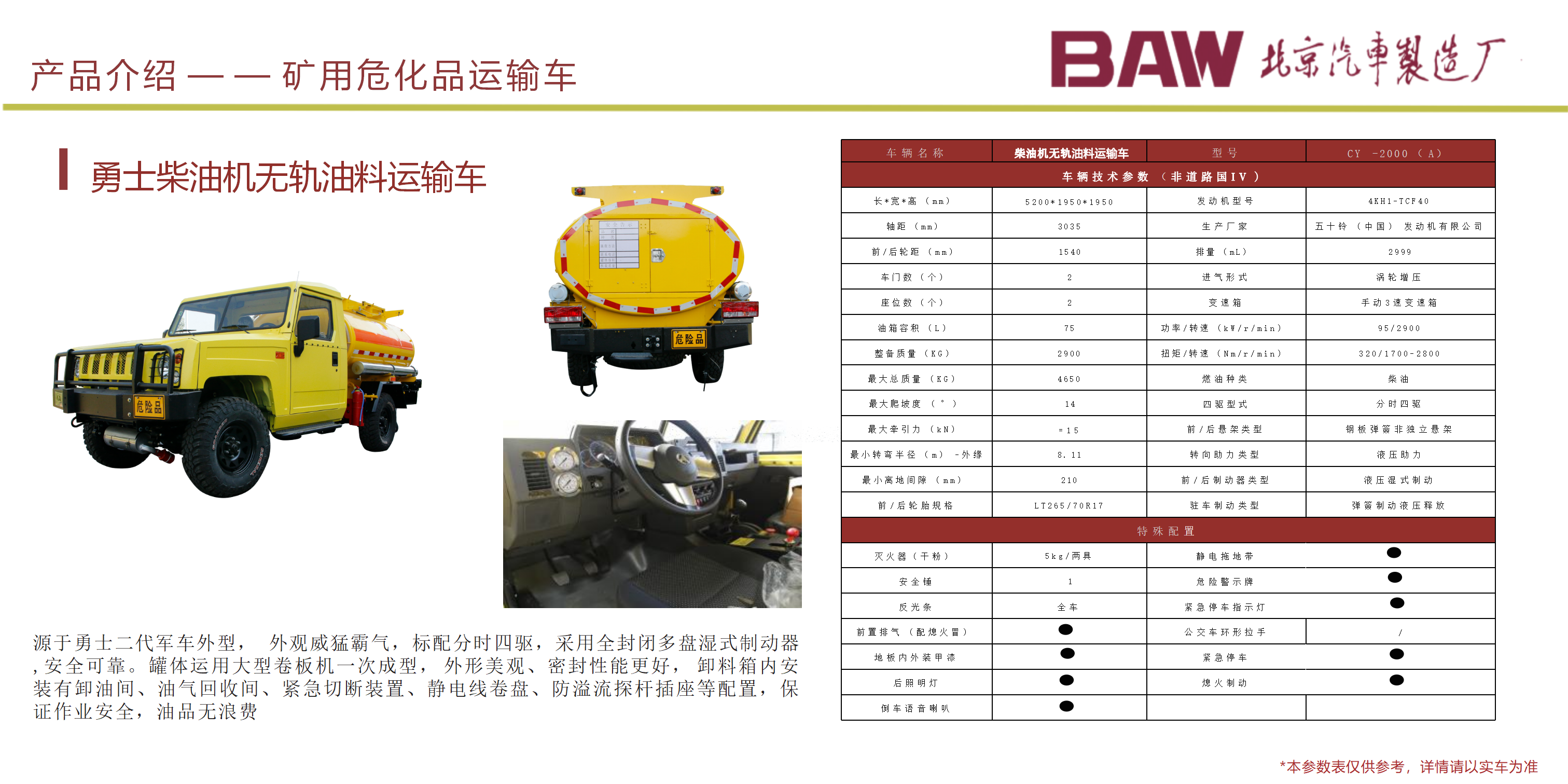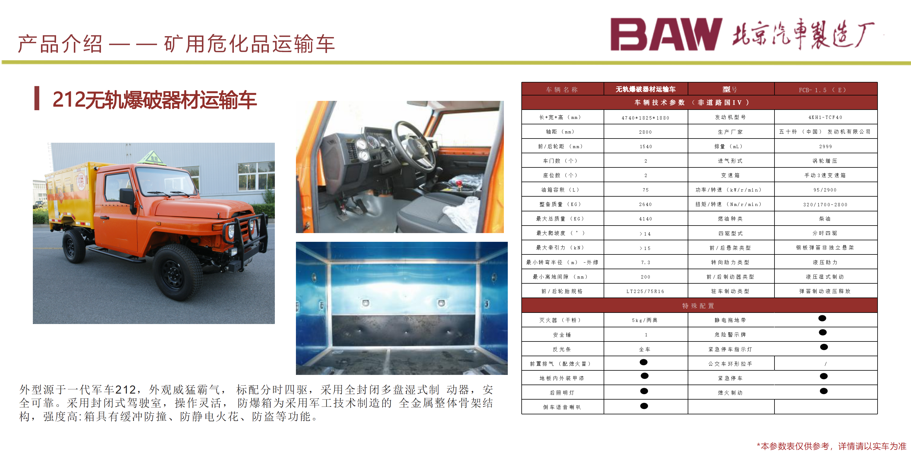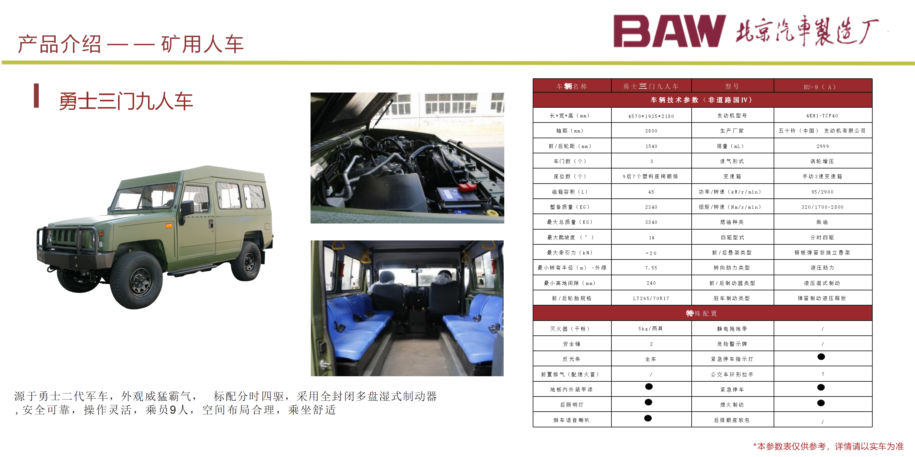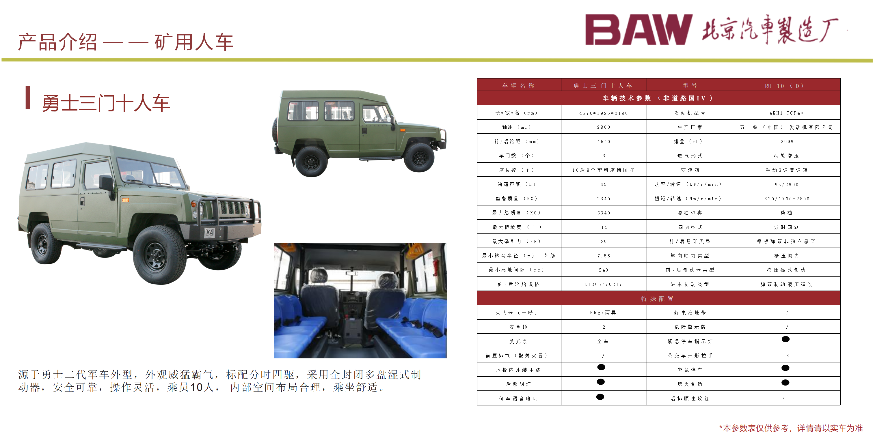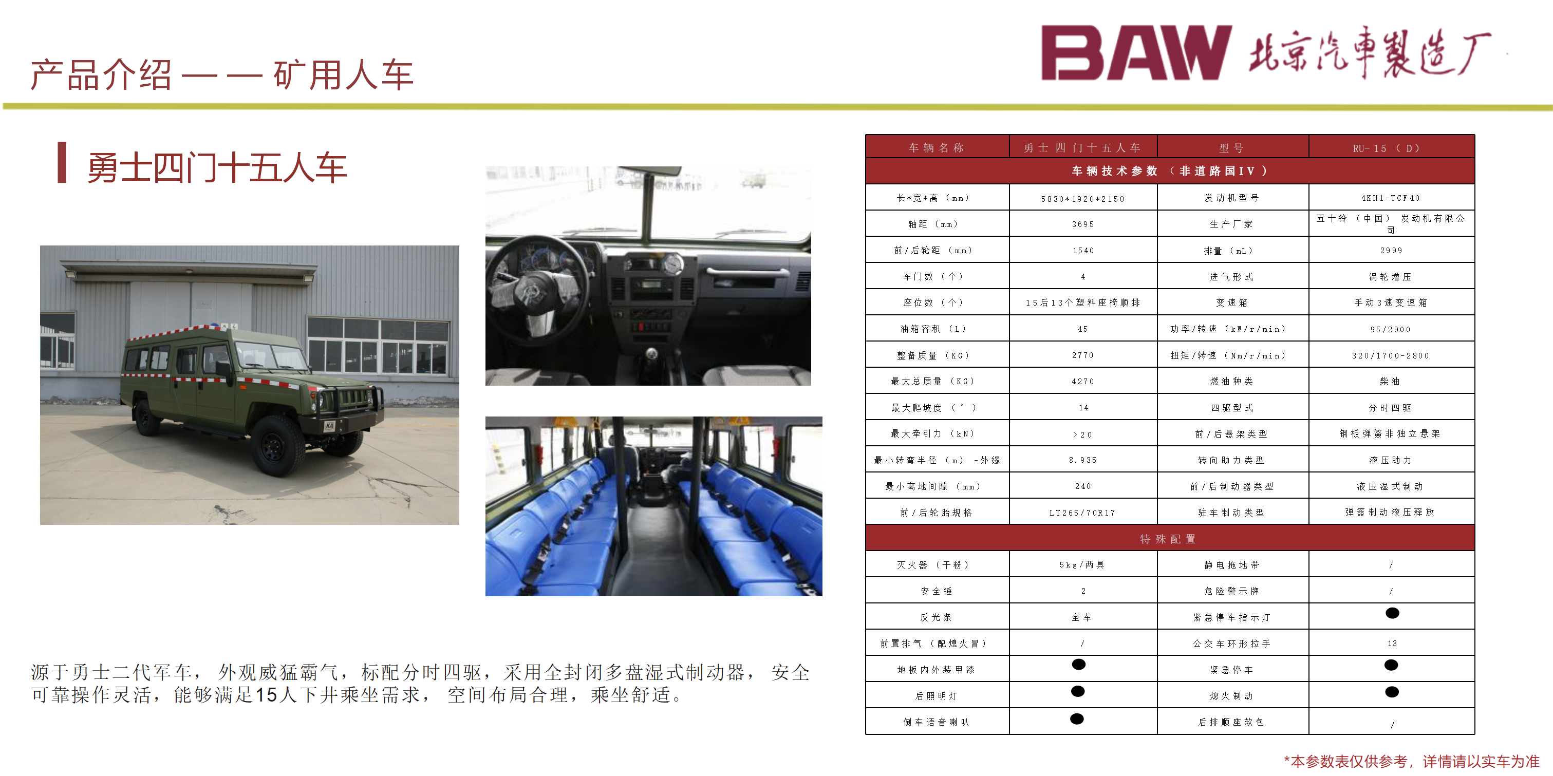 礦安系列車型均符合國(guó)家安全法律法規(guī)要求,具備礦安認(rèn)證文件,已開發(fā)及即將開發(fā)的車型有10、15、19人運(yùn)人車輛及材料車、炸藥車等。 配備國(guó)三江鈴、玉動(dòng)及國(guó)四慶鈴發(fā)動(dòng)機(jī)