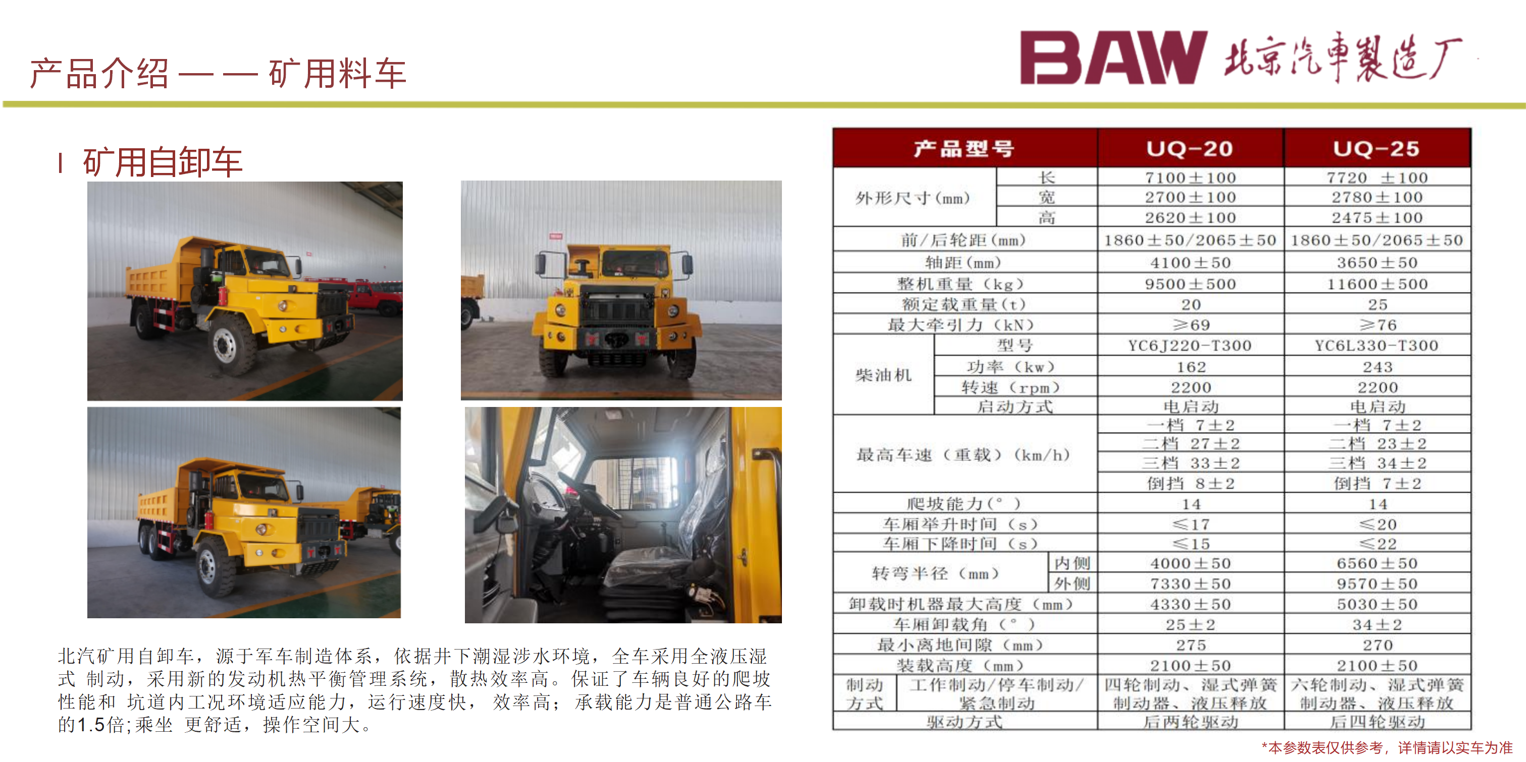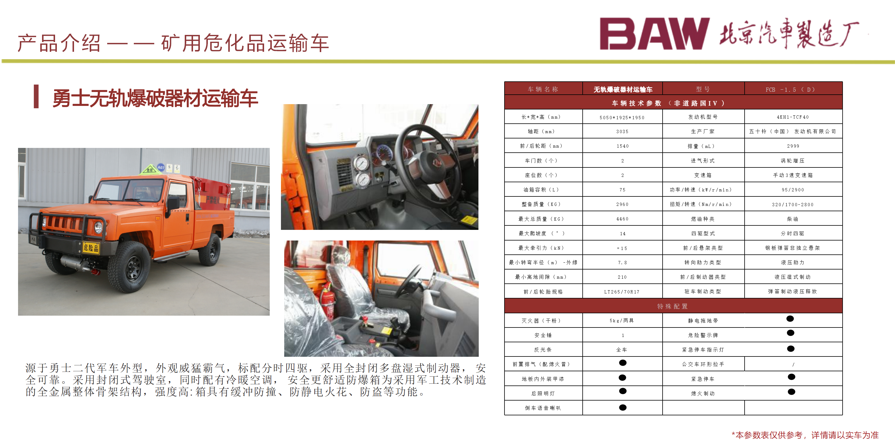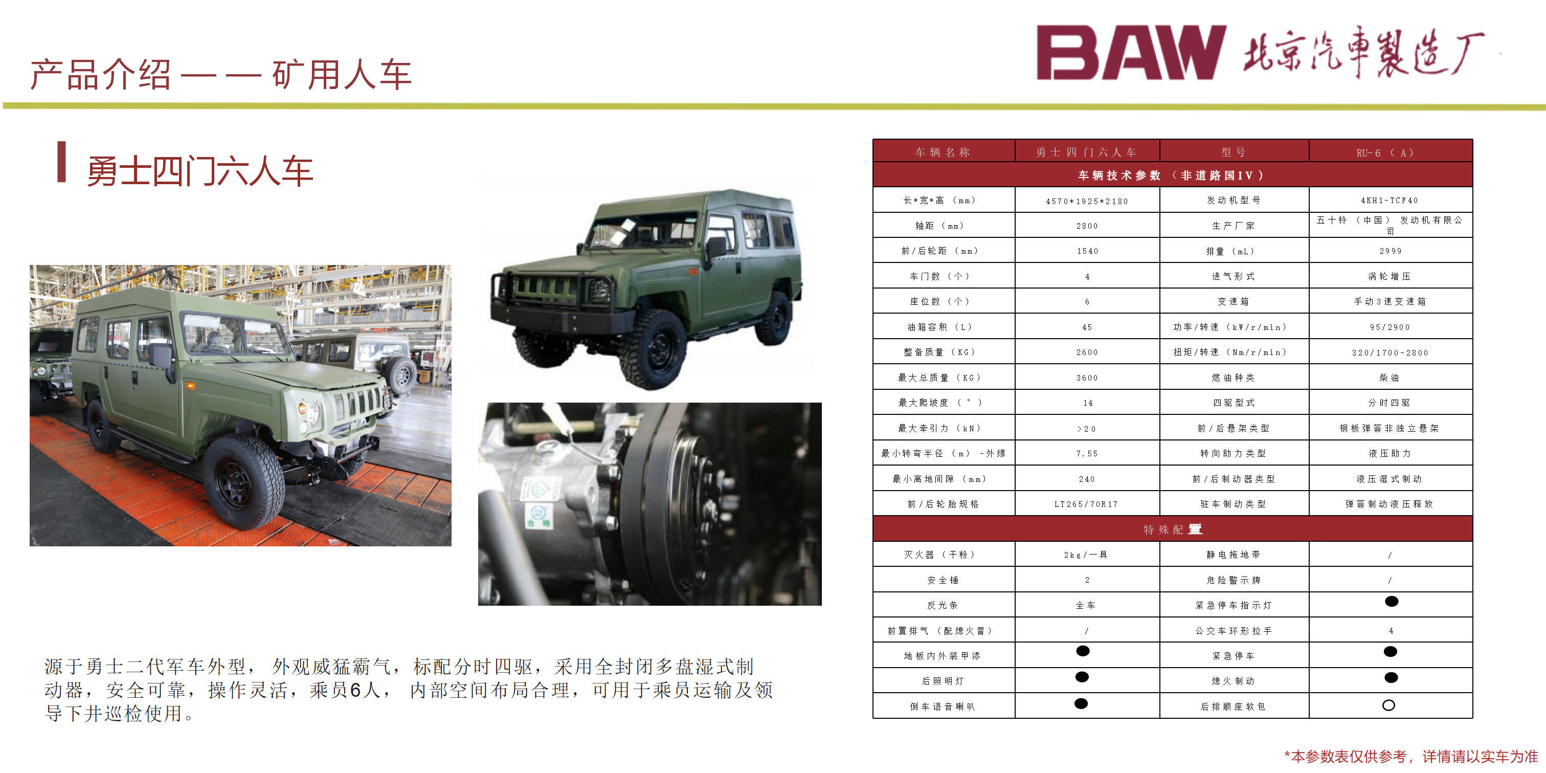 主要用于井下人員的運(yùn)輸 , 以柴油機(jī)為動(dòng)力,適應(yīng)能力強(qiáng); 1、 適用于 3m×3m 巷道斷面的井下運(yùn)輸作業(yè); 2、整車具有耐碰撞性能高、油耗低、綜合運(yùn)行成本低、操作簡(jiǎn)單,乘座舒 適,結(jié)構(gòu)合理,維修、保養(yǎng)容易等諸多優(yōu)點(diǎn); 3、主要電器元件如控制器、液壓、傳動(dòng)系統(tǒng)的關(guān)鍵部件均采用國(guó)內(nèi)外知名 品牌廠家元件,性能可靠; 4、制動(dòng)系統(tǒng)為濕式制動(dòng),彈簧制動(dòng),液壓釋放,安全性能更高;